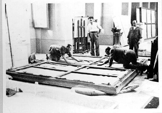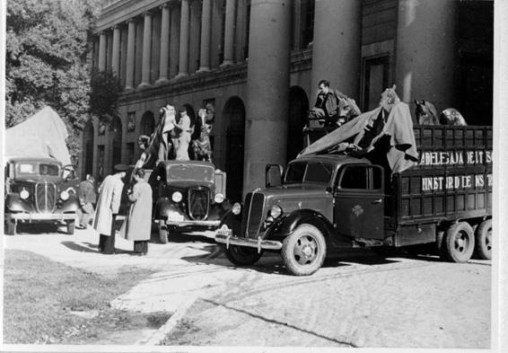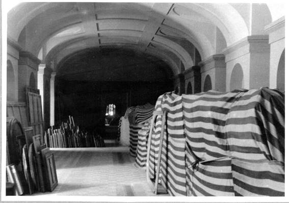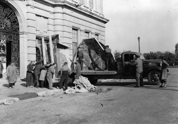 Una vez cerrado el museo, se almacenan 250 piezas que figuraban en una lista de emergencia y que debían ponerse a buen recaudo al primer signo de alarma. Se alojan en los sótanos y en la rotonda baja —considerados los lugares más seguros— y se protege el edificio.
